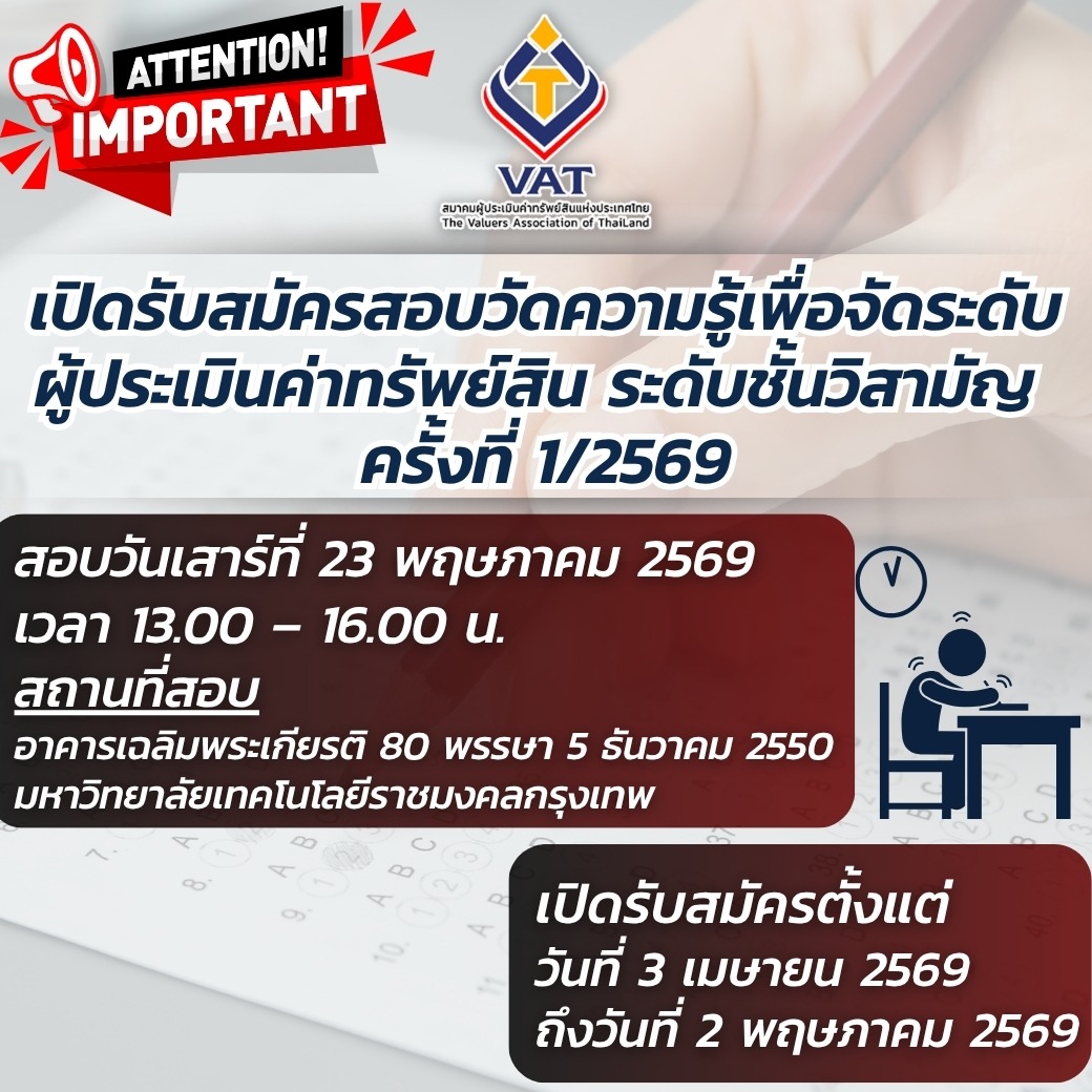 เปิดรับสมัครสอบวัดความรู้เพื่อจัดระดับผู้ประเมินค่าทรัพย์สิน ระดับชั้นวิสามัญ ครั้งที่ 1/2569